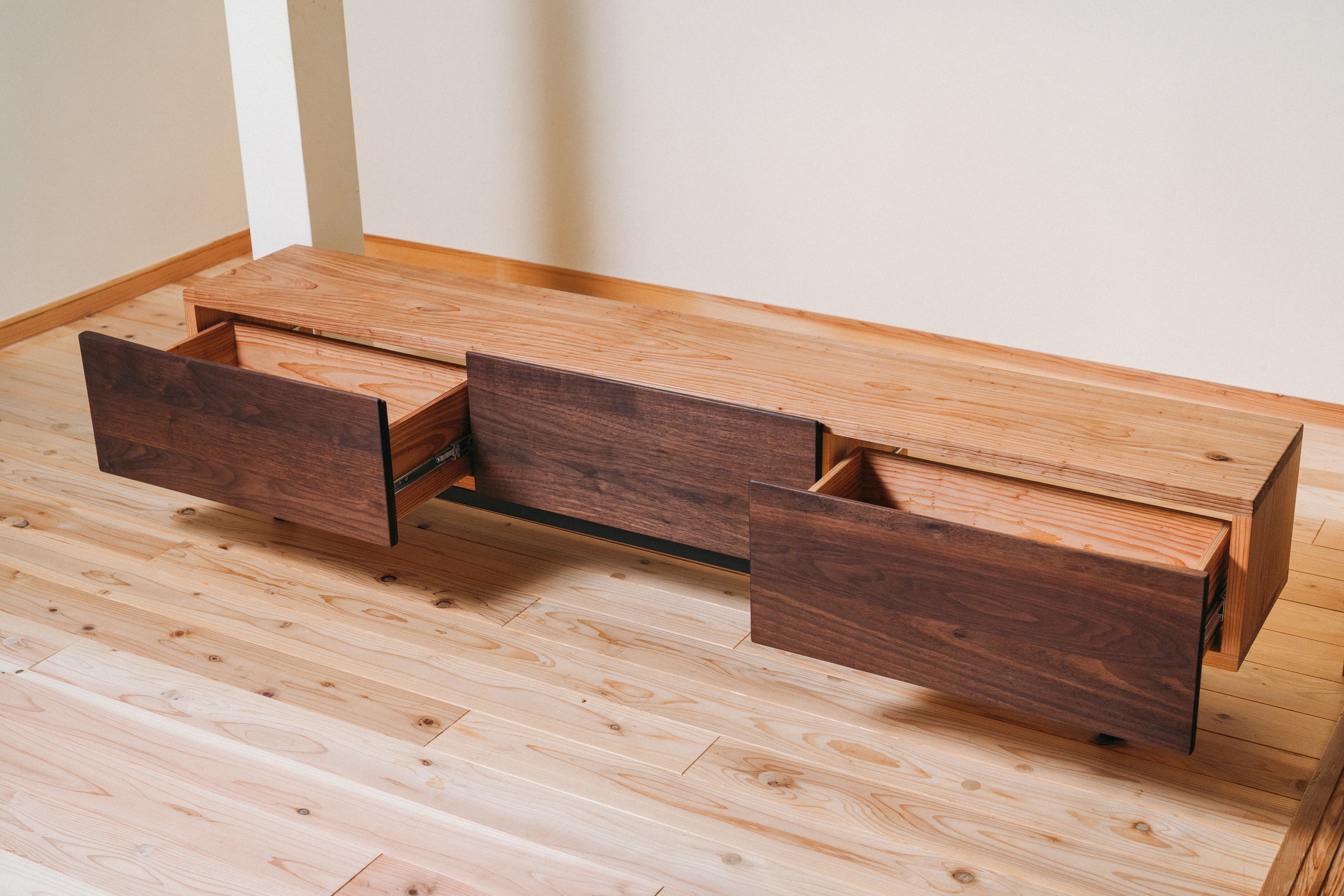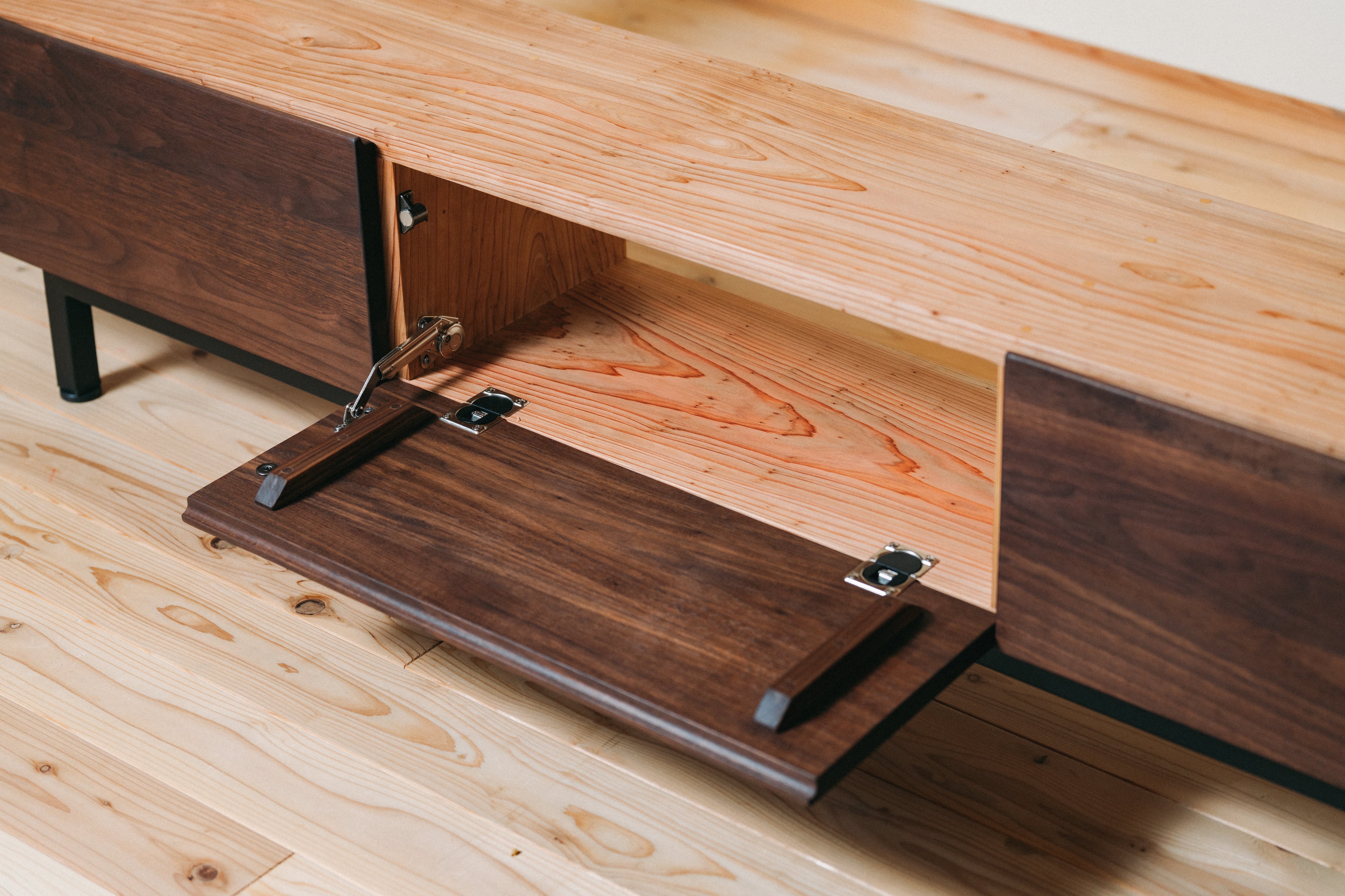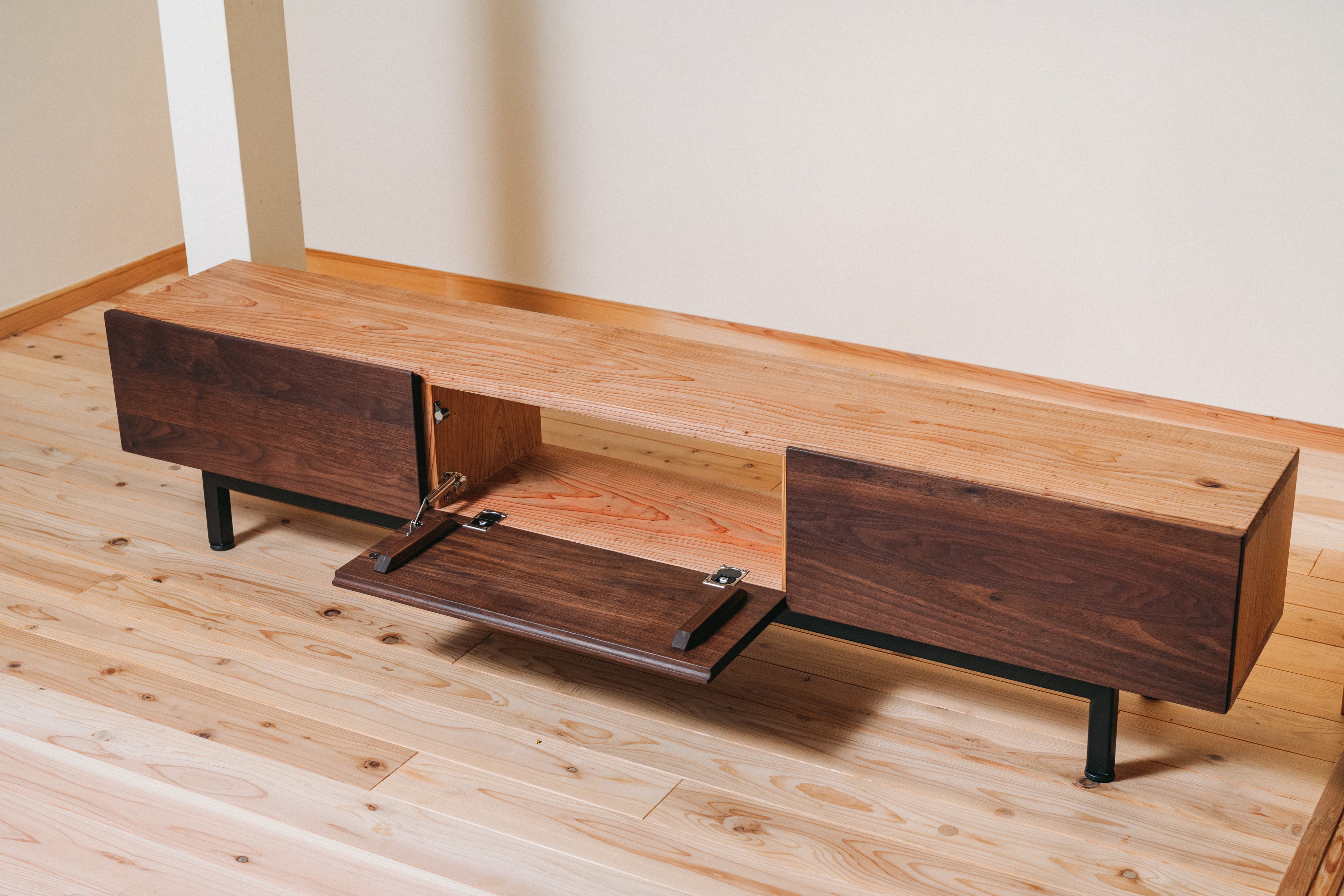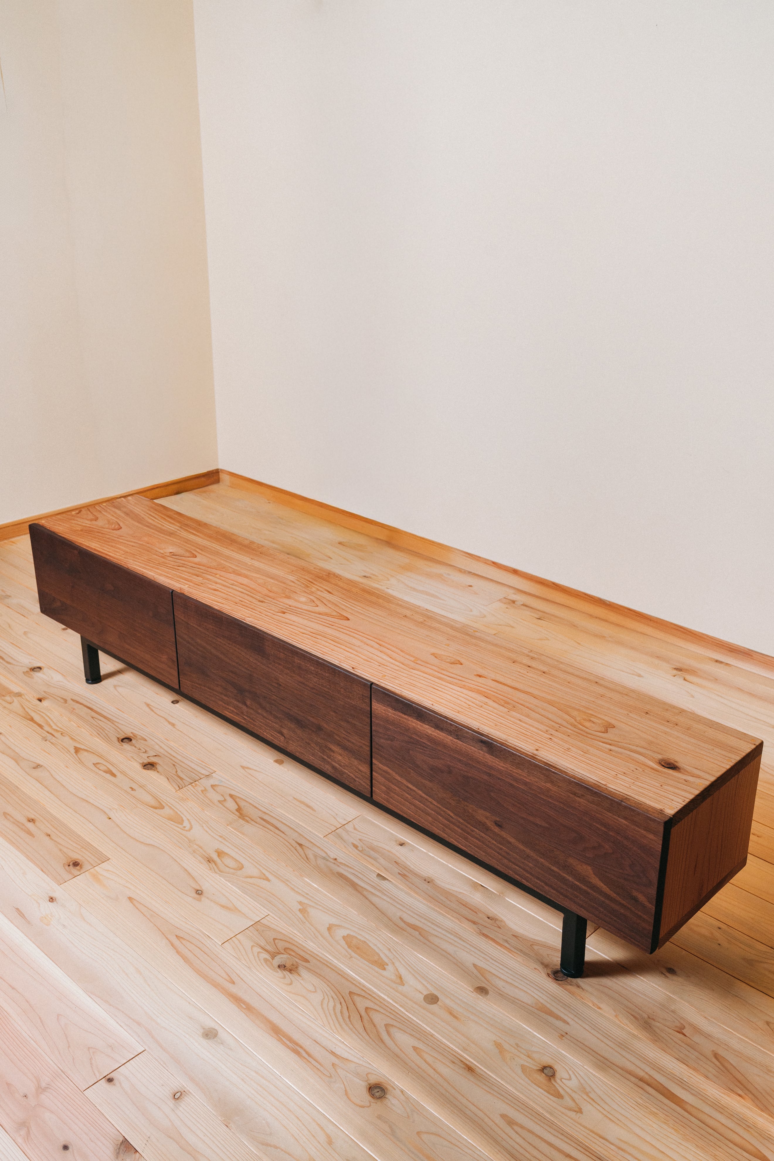 杉とウォールナットの無垢材を組み合わせ、スチール脚で引き締めたテレビボードです。