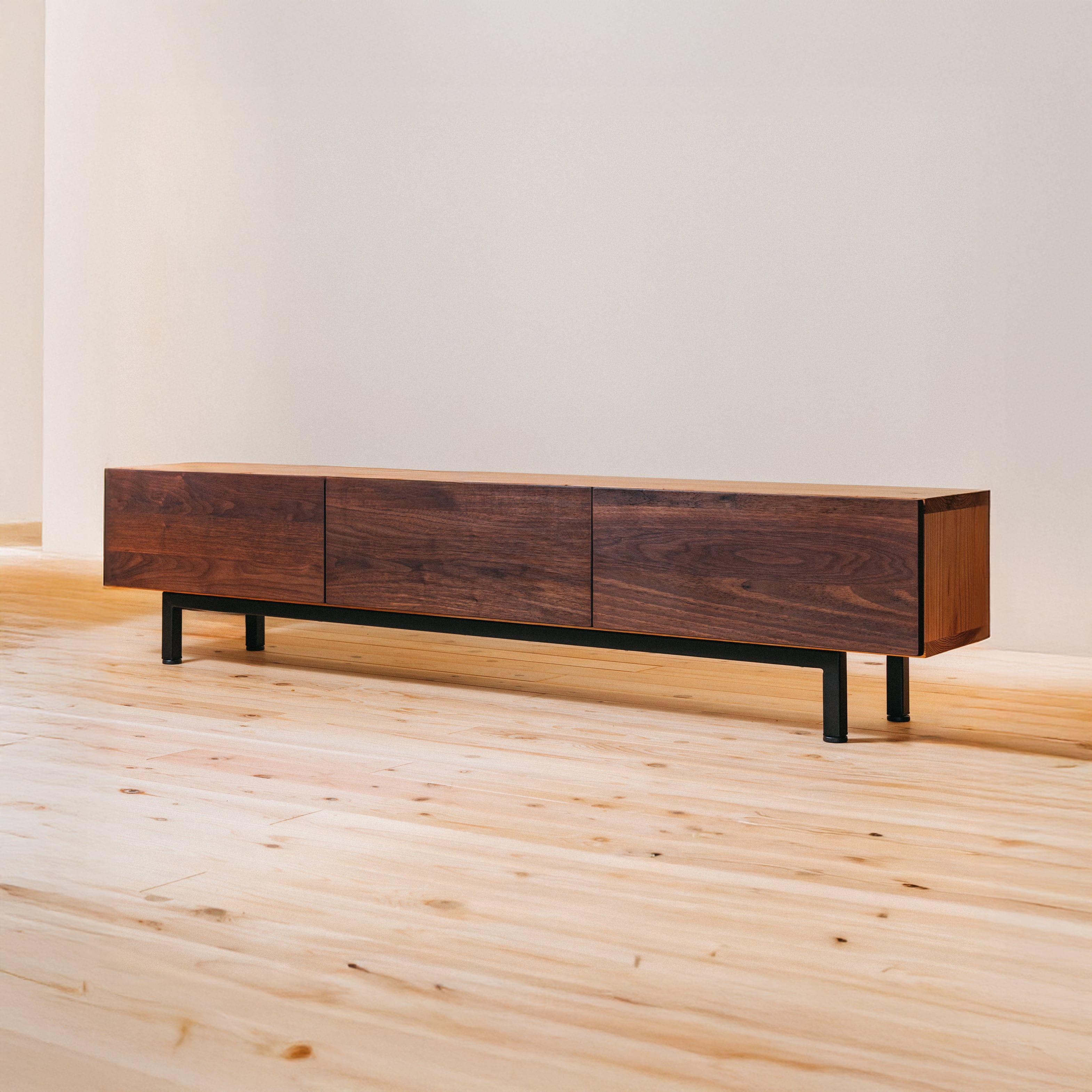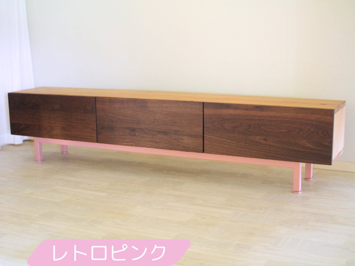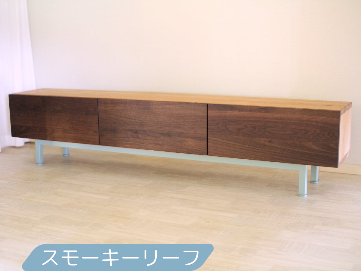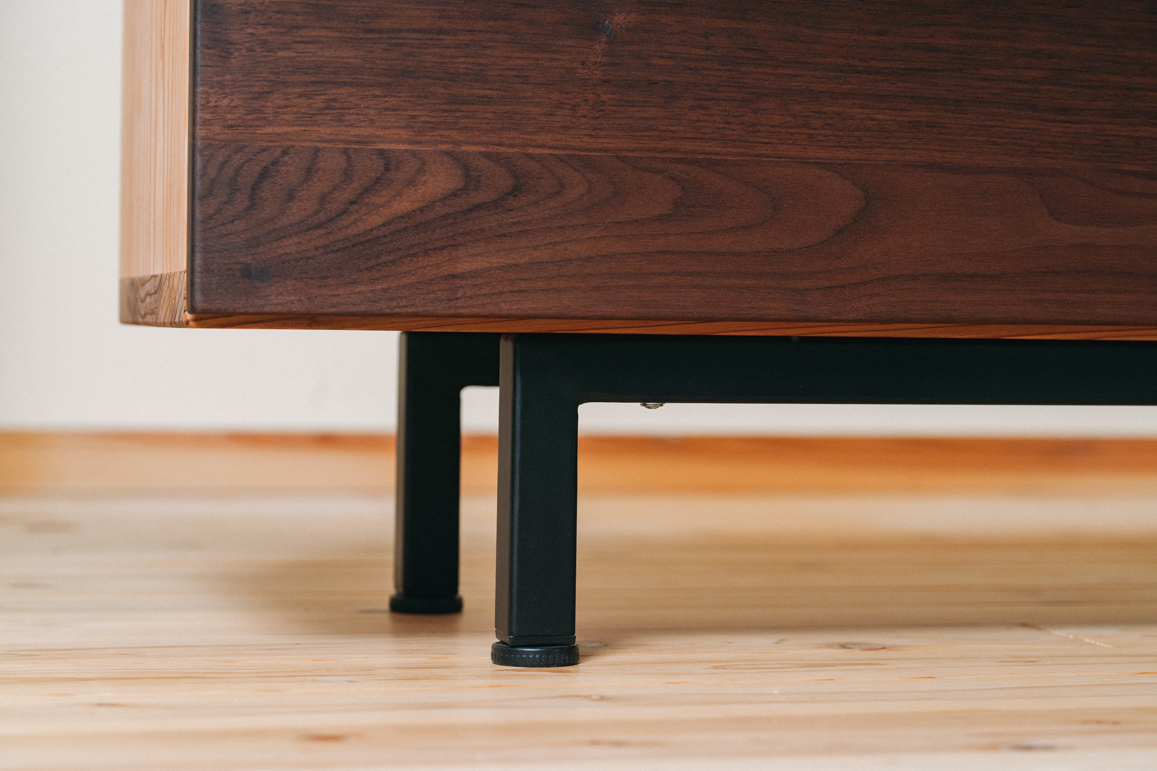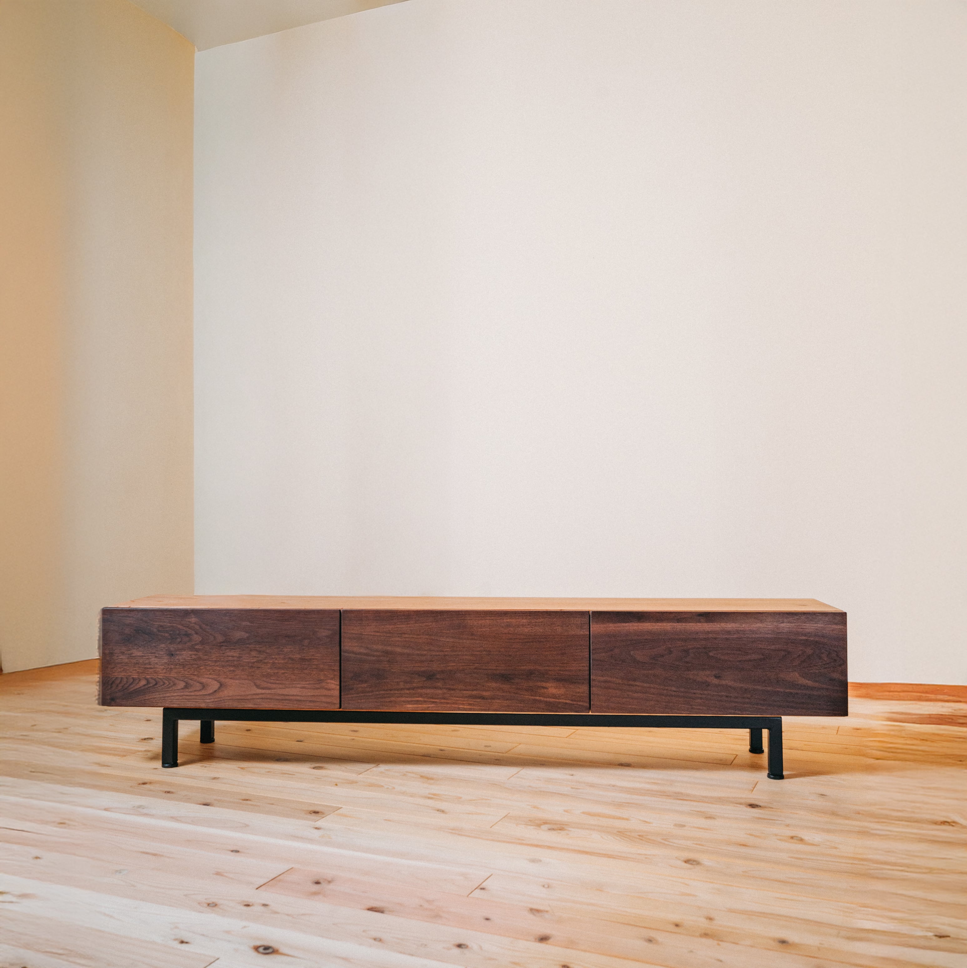 杉とウォールナットの無垢材を組み合わせ、スチール脚で引き締めたテレビボードです。