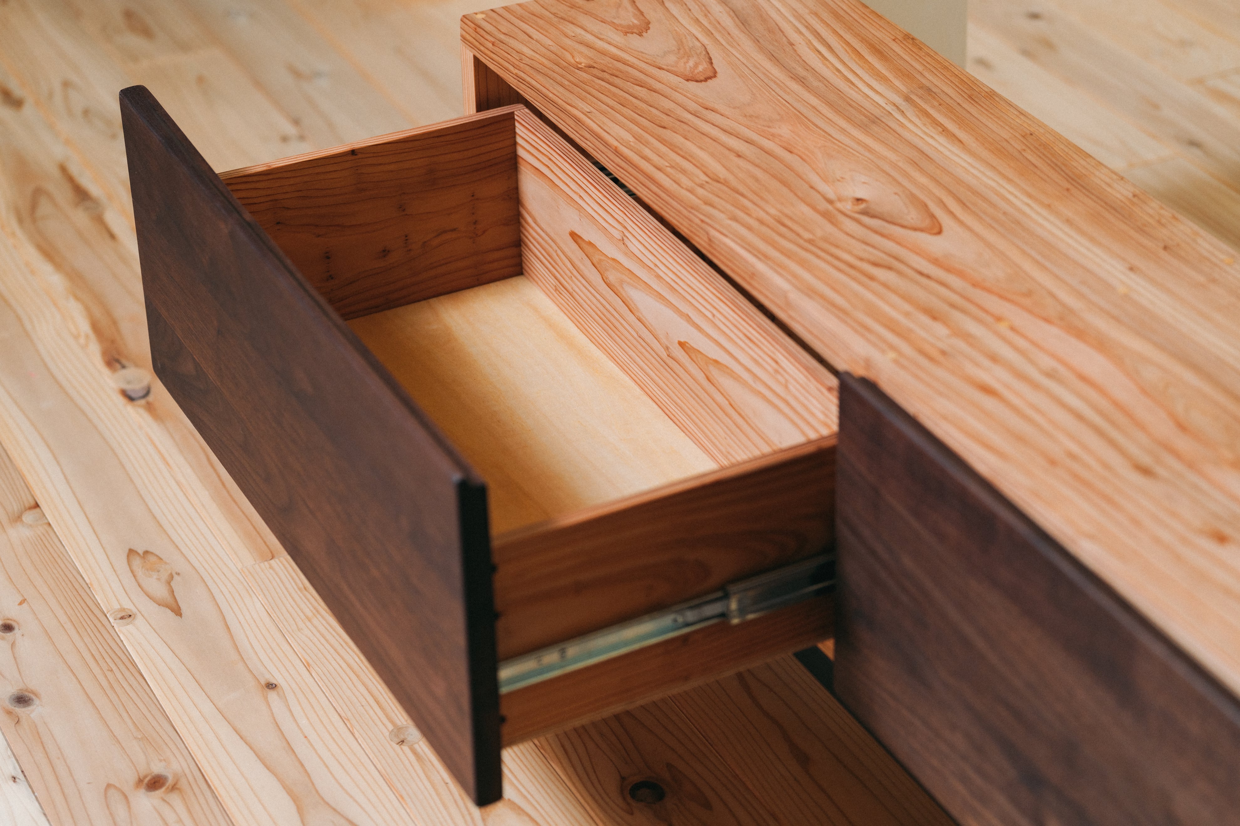 杉材をメインに使用しつつ、高級木材であるウォールナットを収納の前板に使用しました。